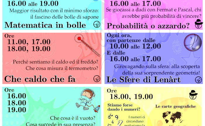 L’iniziativa, aperta agli studenti di tutte le età e alla cittadinanza, sarà un’occasione per partecipare gratuitamente ai laboratori didattici realizzati durante il progetto, con l'aggiunta di altri stand dove sperimentare nuovi giochi matematici, esperimenti scientifici, laboratori di fisica e sfide di intelligenza. Previste anche presentazioni divulgative da parte di dottorandi del Dipartimento di Matematica e Informatica, in merito al loro lavoro di ricerca.