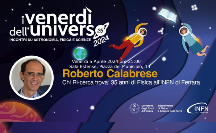 “Chi Ri-cerca trova: 35 anni di Fisica all’INFN di Ferrara” Roberto Calabrese, direttore della Sezione di Ferrara dell’INFN Antonio Zoccoli, Presidente dell’Istituto Nazionale di Fisica Nucleare Venerdì 05 Aprile 2024 dalle 21:00 alle 23:00 Sala Estense, Piazza del Municipio, 14 https://www.unife.it/…/2024/aprile/venerdi-delluniverso Per chi fosse impossibilitato a partecipare in presenza: YouTube https://www.youtube.com/c/IVenerdìdellUniverso