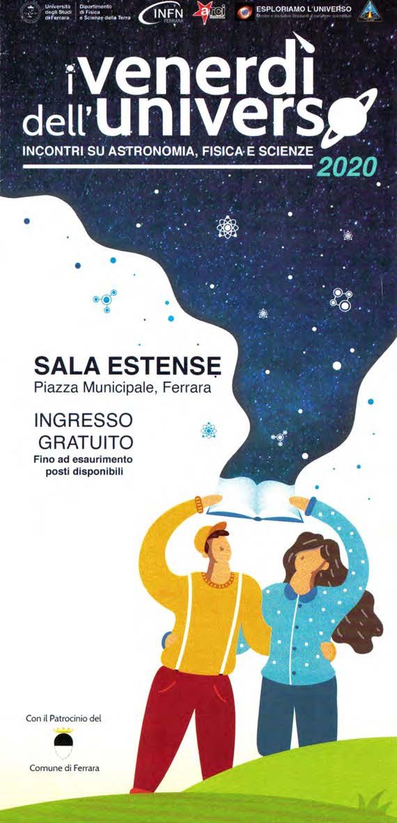 | Curatore Responsabile: Federico Spizzo e-mail: spizzo@fe.infn.it – Tel. 0532/ 974231 Organizzazione: Michele Parise e-mail: parise@fe.infn.it – Tel. 0532/ 974209 Assistenza Tecnica: Gloriano Bighi e-mail: gloriano.bighi@unife.it – Tel. 0532/ 974907 Segreteria Organizzativa: Paola Fabbri e-mail: paola@fe.infn.it – Tel. 0532/ 974280 • • PER INFORMAZIONI Dipartimento di Fisica e Scienze della Terra via G. Saragat, 1 Tel. 0532/ 974211 fst.unife.it www.fe.infn.it e-mail: venerdiuniverso@fe.infn.it Gruppo Astrofili “Columbia” Via Baccanazza, 13 – 45030 S. Maria Maddalena (RO) Giovanni Santarato: Tel. 348 3021576 www.astrofilicolumbia.it – info@astrofilicolumbia.it Esploriamo l’Universo Ferruccio Zanotti: 331 7814370 Massimiliano Di Giuseppe: 338 5264372 esploriamoluniverso@gmail.com www.esploriamoluniverso.com | ||